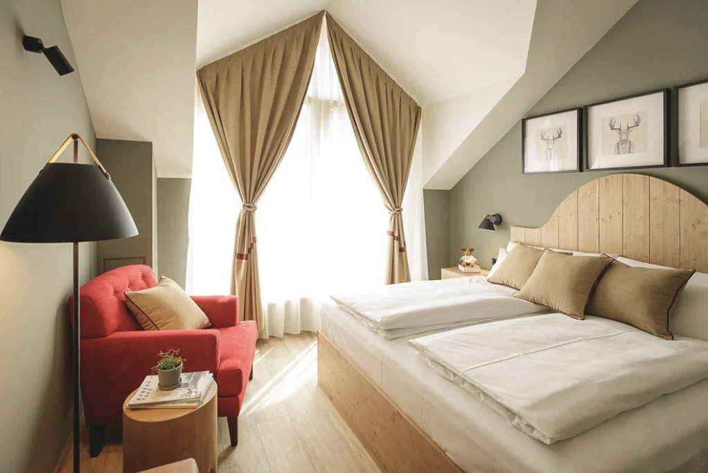 The Royal Family’s Choice. Size: 40 m2. Bed: King-size 180 x 200 cm. Views: Julian Alps, Botanical park and the River.